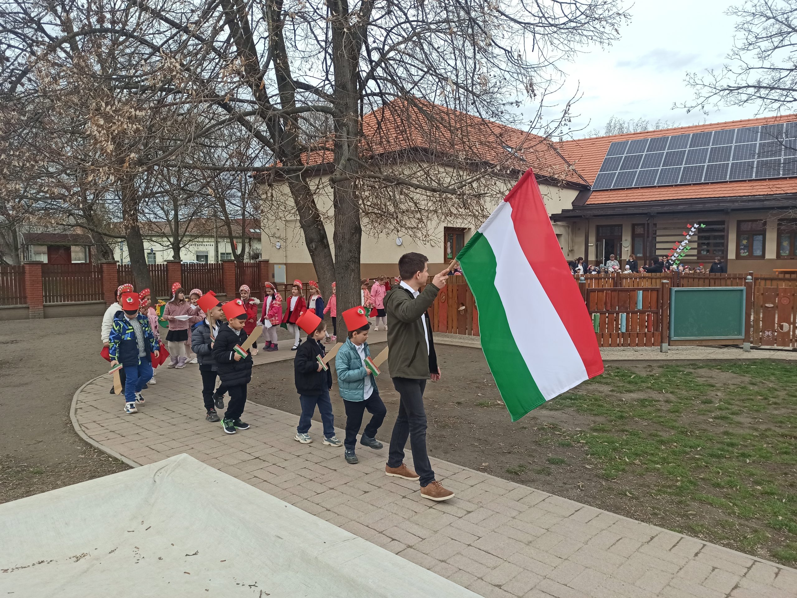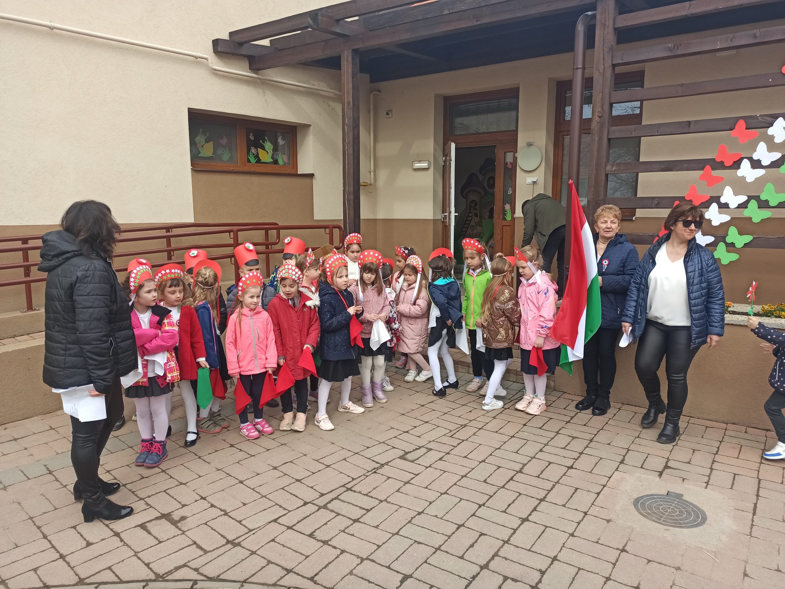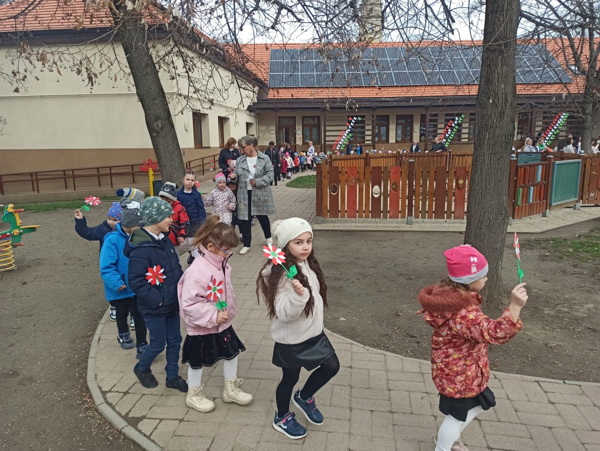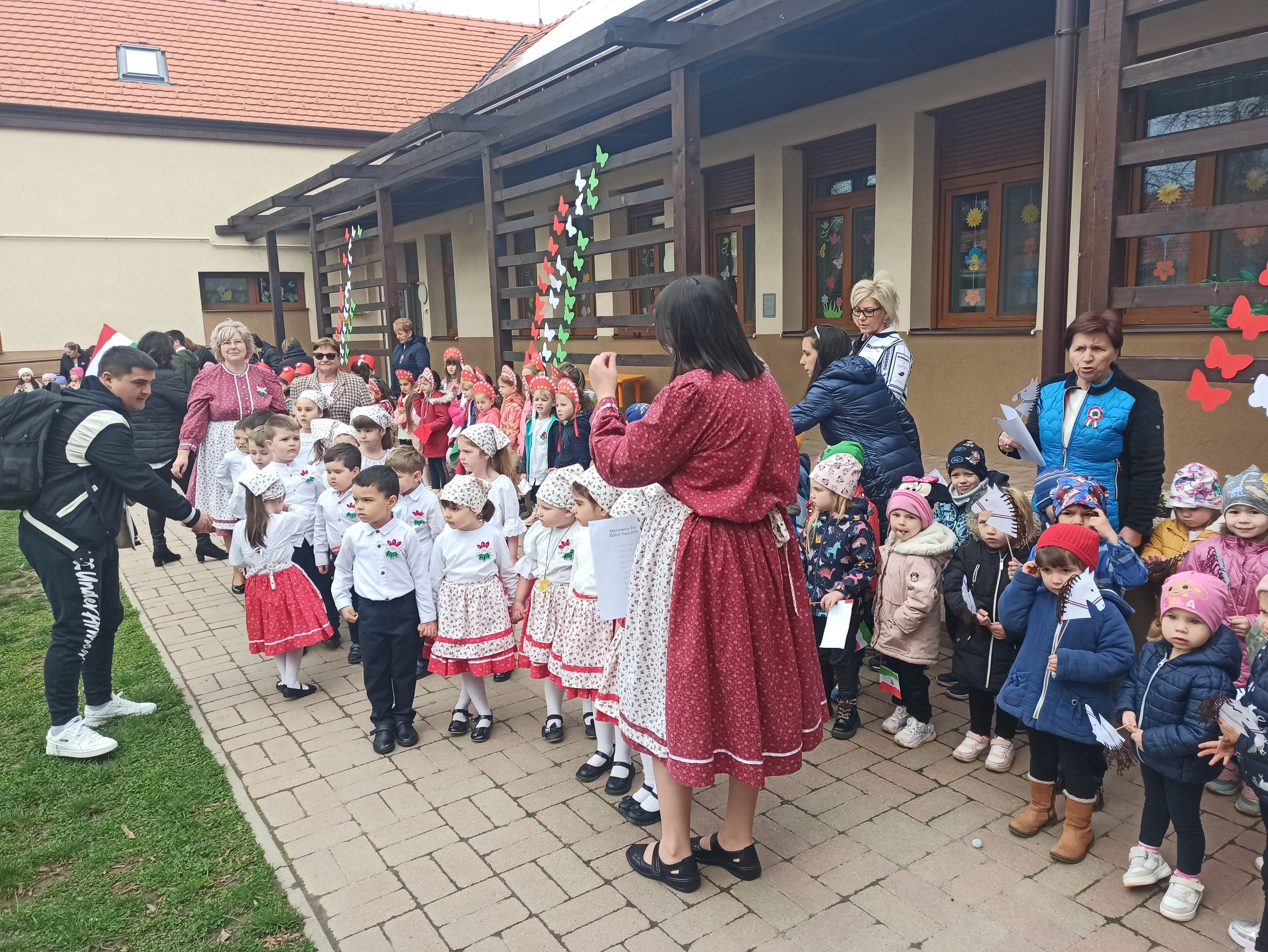 Péntek délelőtt a román és a magyar óvodások együtt ünnepelték március 15-ét. Az udvaron zeneszóra, piros-fehér-zöld magyar nemzeti színekben masírozott a vidám gyereksereg. Birta Júlia Mihaéla elárulta: a Pécskáról jött gyerekek közül tizennégyen vegyes házasságban születtek, vagyis egyik szülő román, a másik magyar, így többségük mind a két nyelven beszél. Ezért nem volt gond, mikor az 1848–49-es magyar katonadalokat kellett énekelni.