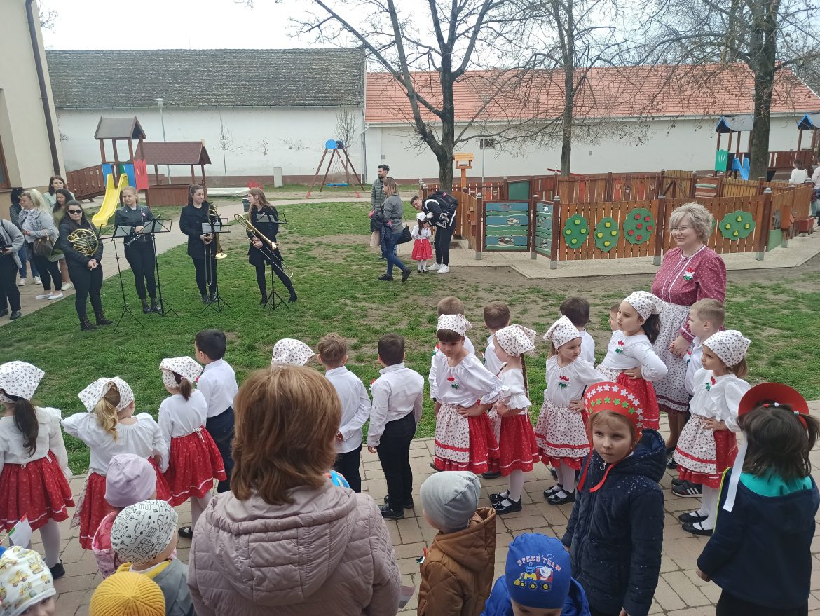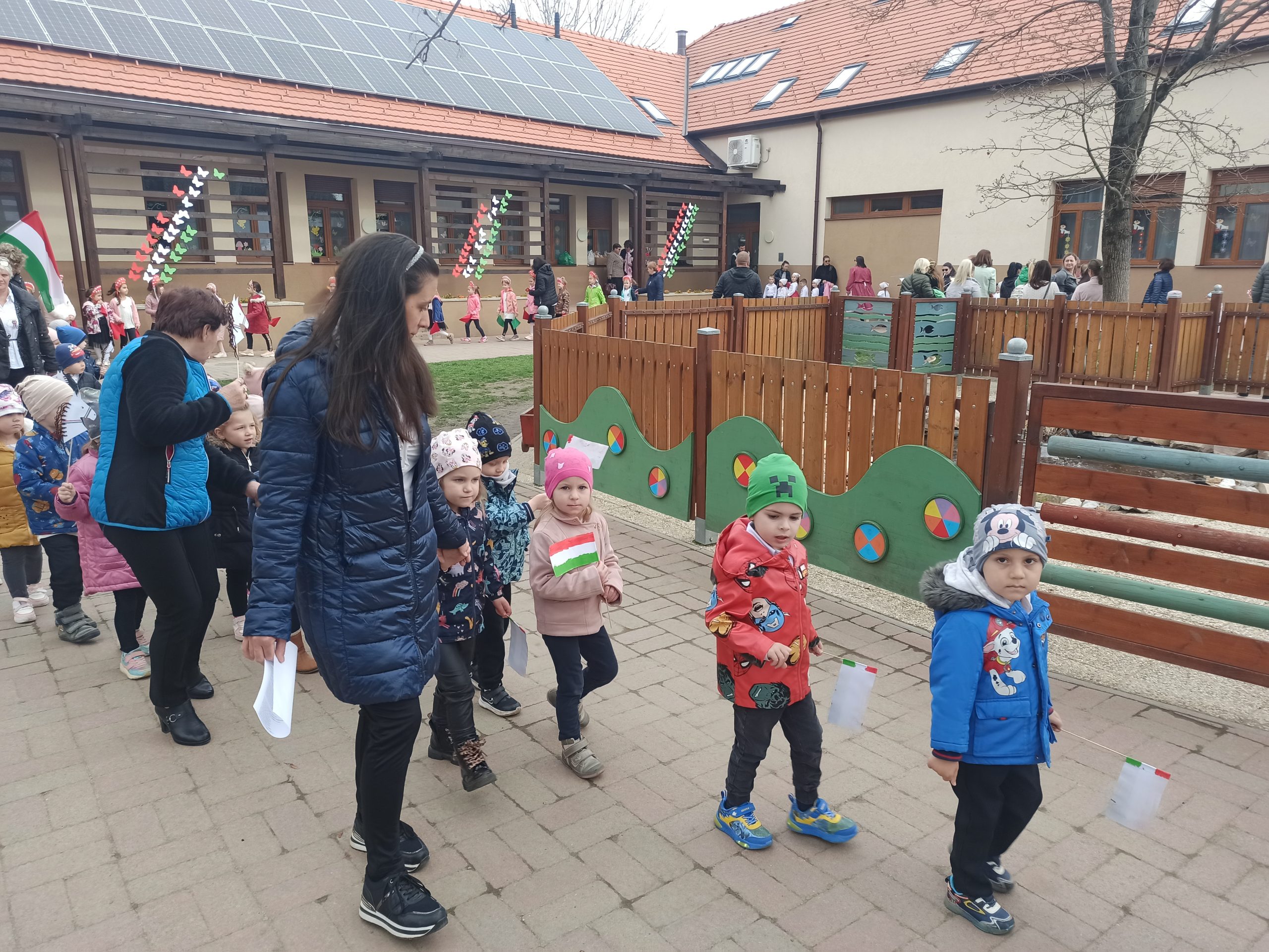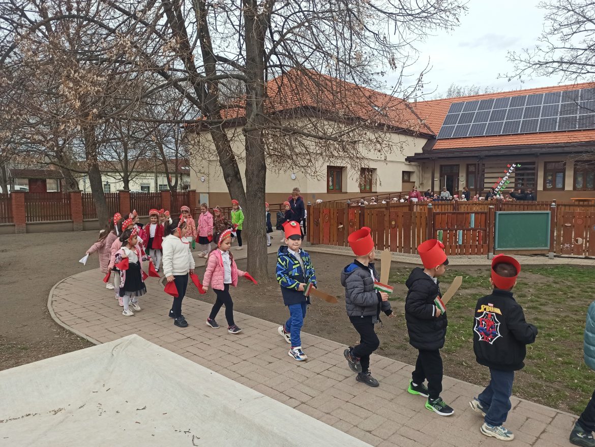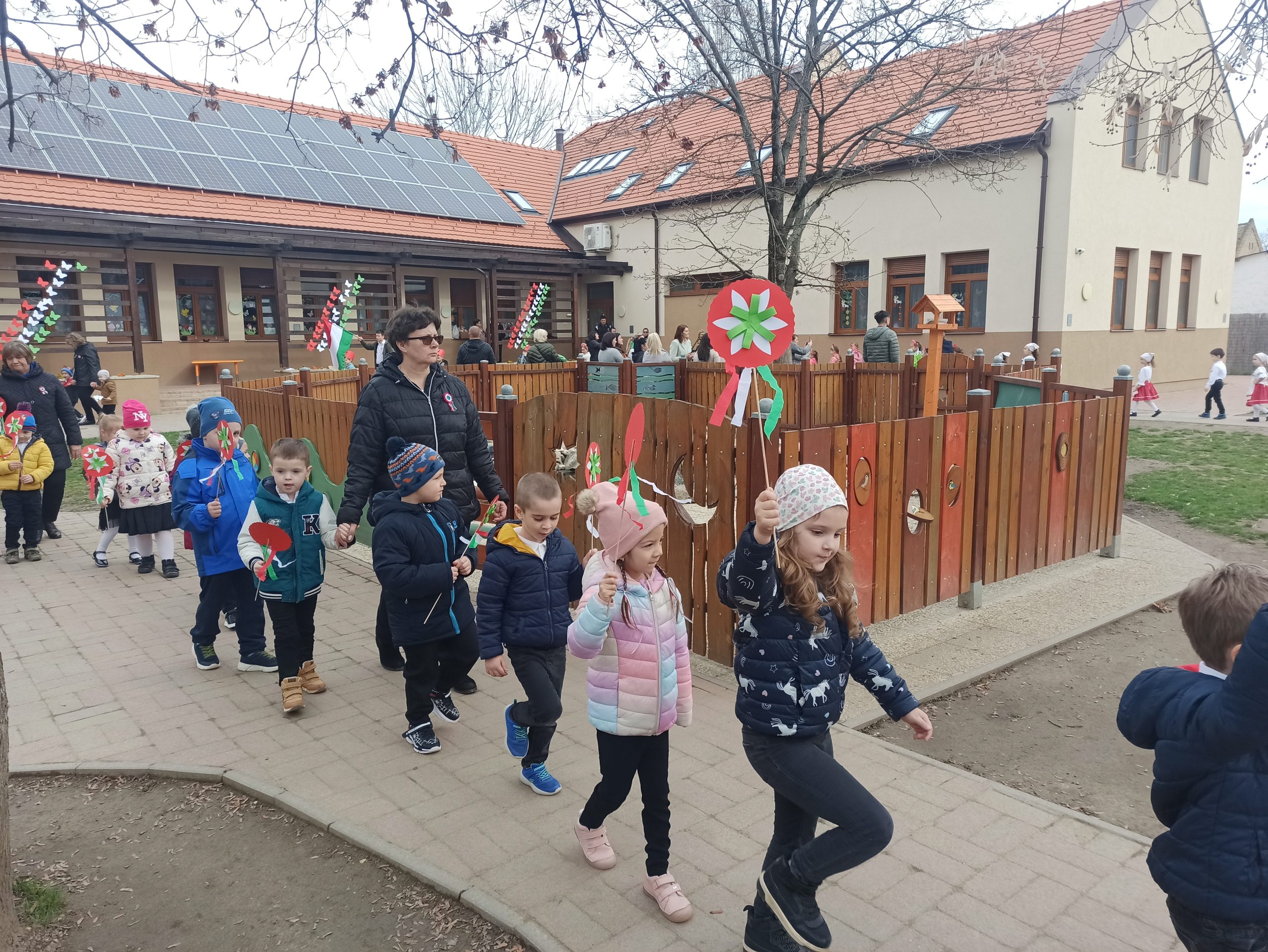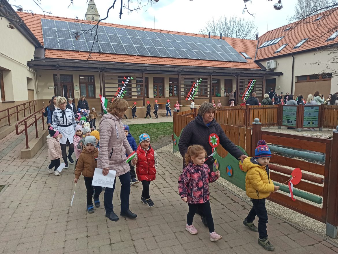 Péntek délelőtt a román és a magyar óvodások együtt ünnepelték március 15-ét. Az udvaron zeneszóra, piros-fehér-zöld magyar nemzeti színekben masírozott a vidám gyereksereg. Birta Júlia Mihaéla elárulta: a Pécskáról jött gyerekek közül tizennégyen vegyes házasságban születtek, vagyis egyik szülő román, a másik magyar, így többségük mind a két nyelven beszél. Ezért nem volt gond, mikor az 1848–49-es magyar katonadalokat kellett énekelni.