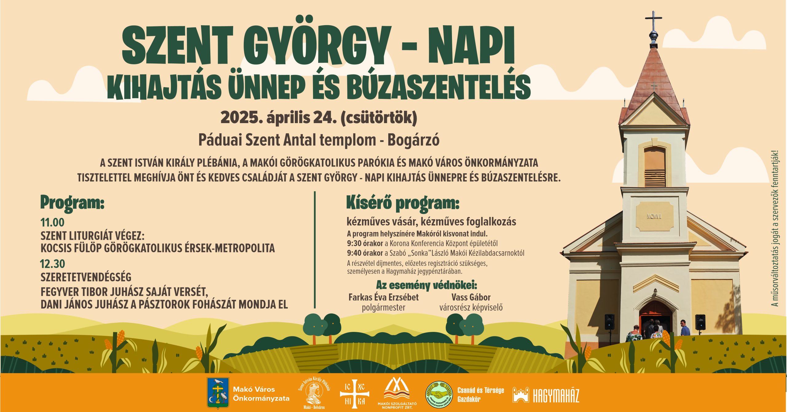 Idén is lesz Szent György-napi kihajtás és búzaszentelés Bogárzón, Páduai Szent Antal templománál, ahol Kocsis Fülöp görögkatolikus érsek-metropolita végez liturgiát, majd szeretetvendégséggel és kézműves vásárral és kézműves foglalkozásokkal folytatódik a program.