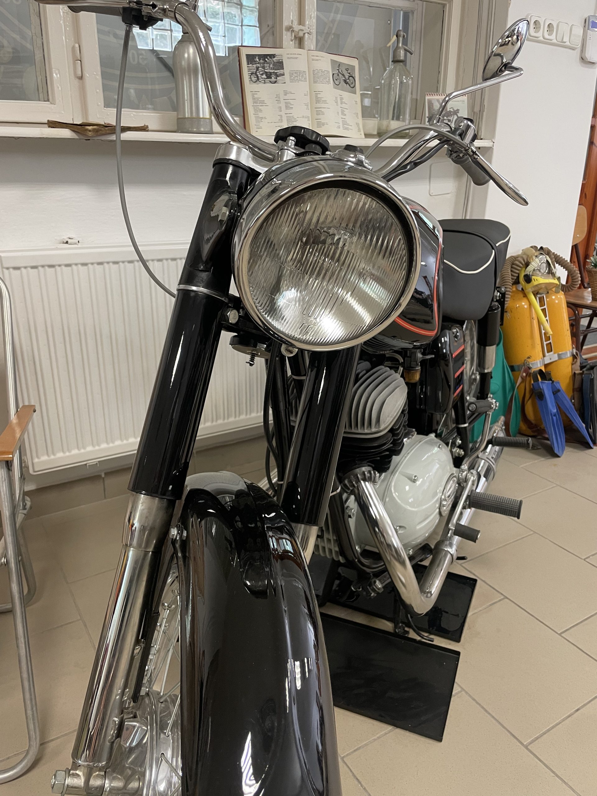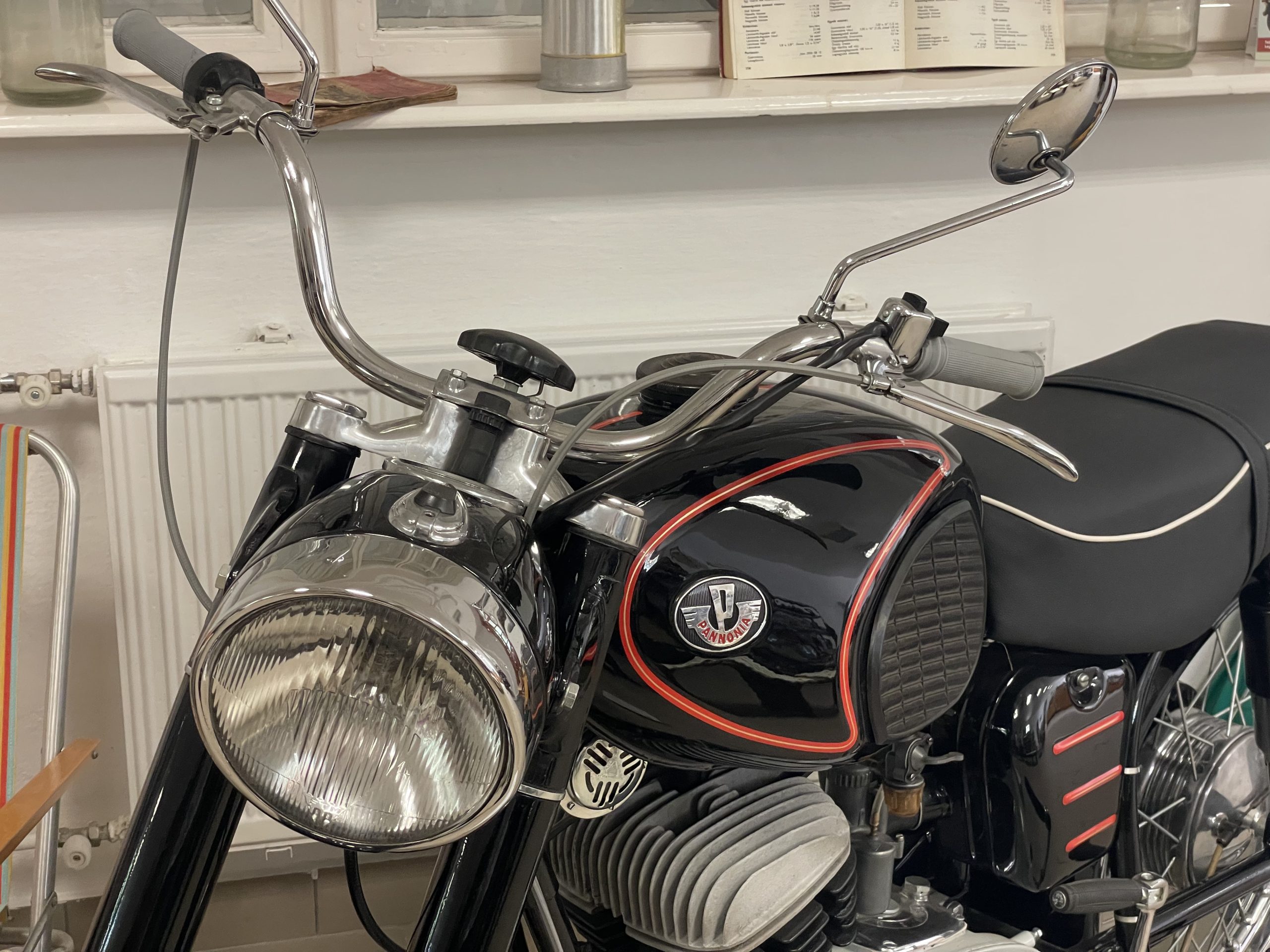 És ha már szóba került a család: a közelben egy Pannónia P10-es motorkerékpár áll, amit házigazdánk Marci fia restaurált, ez volt az Óbudai Egyetemen a vizsgamunkája. A P10 a hazai motorkerékpár-gyártás egyik legendás járműve volt, 1967 és 1974 között gyártották. Léghűtéses, 266 köbcentis motor hajtotta, ami legfeljebb 120 kilométer/órás sebességre volt képes. Fénykorában sem számított a legszebb vagy a legkorszerűbb motorkerékpárnak, viszont megbízhatósága miatt hosszú évekig, évtizedekig szolgálta ki gazdáját, sokak csodálatát kiváltva.
