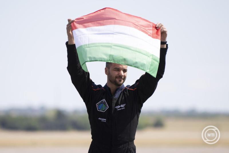 A kutatóűrhajós a Magyar Honvédség repülőgépével érkezett Budapestre, ahol a gépből kiszállva magyar zászlót lengetett.