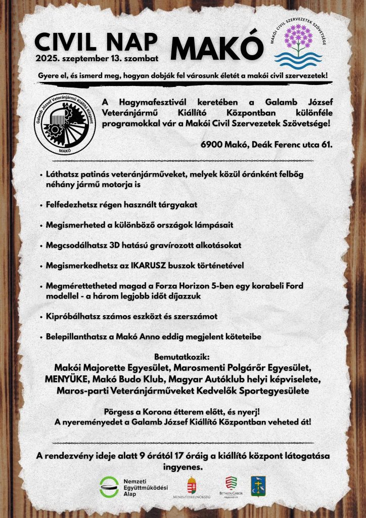 A Hagymafesztiválhoz kapcsolódva, szeptember 13-án szombaton 9 és 17 óra között izgalmas programokkal várják a látogatókat a Galamb József Veteránjármű Kiállító Központban. Amellett, hogy a régmúlt idők járműveit csodálhatják meg az érdeklődők, más szórakozási lehetőségekkel is készül a Makói Civil Szervezetek Szövetsége – tudtuk meg az egyesület elnökétől, Szilágyi Lászlótól.