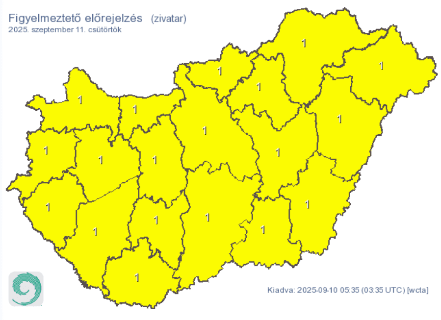 Szeptember 10-re, azaz csütörtökre egész Magyarországra citromsárga figyelmeztetést adtak ki. A HungaroMet figyelmeztet: zivatar alakulhat ki. Elsődleges veszélyforrást a villámlás jelent, de szélerősödés és akár jégeső is előfordulhat.