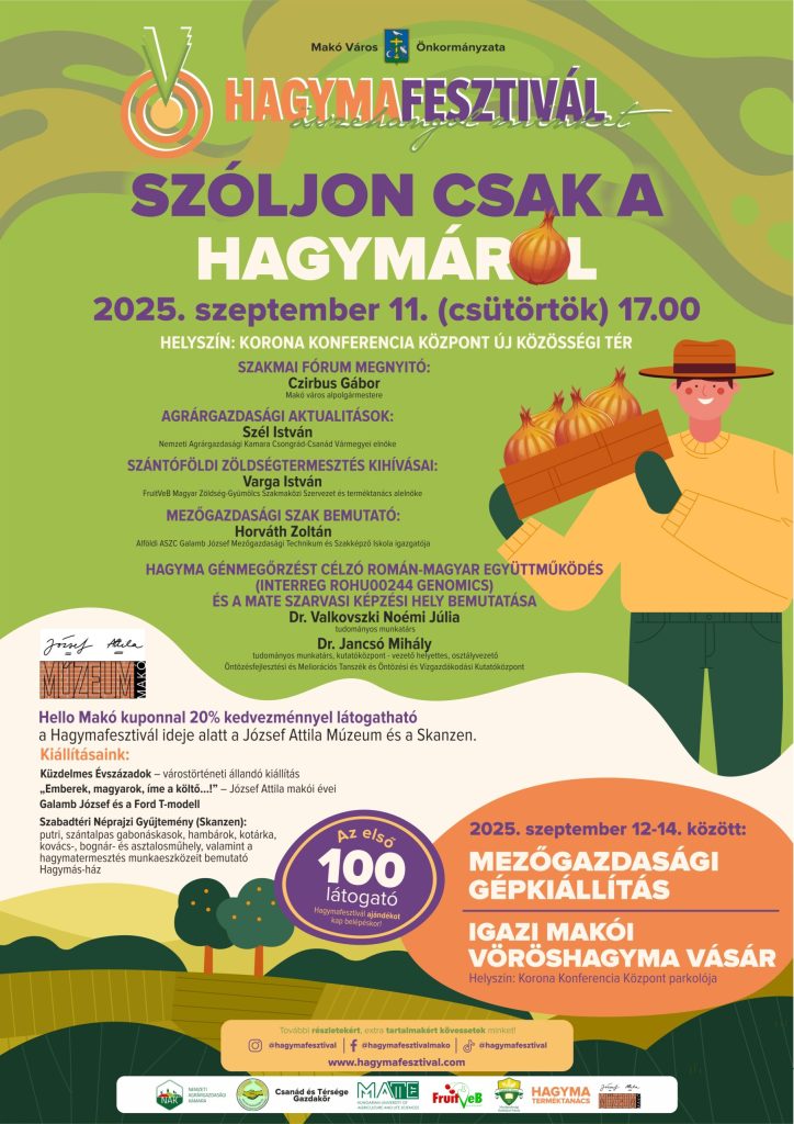 A szeptember 11-én, csütörtökön 17.00 órakor kezdődő szakmai fórumot Czirbus Gábor, Makó alpolgármestere nyitja meg, majd Szél István, a Nemzeti Agrárgazdasági Kamara vármegyei elnöke a mezőgazdaság helyzetéről, míg Varga István, a FruitVeb Magyar Zöldség-Gyümölcs Szakmaközi Szervezet és Terméktanács alelnöke a szántóföldi zöldségtermesztés előtt álló kihívásokról beszél. A fórumon Horváth Zoltán, az Alföldi ASZC Galamb József Mezőgazdasági Technikum igazgatója az oktatási intézmény mezőgazdasági szakját mutatja be a közönségnek, majd Valkovszki Noémi Júlia és Jancsó Mihály a hagyma génmegőrzést célzó román-magyar együttműködést ismerteti.