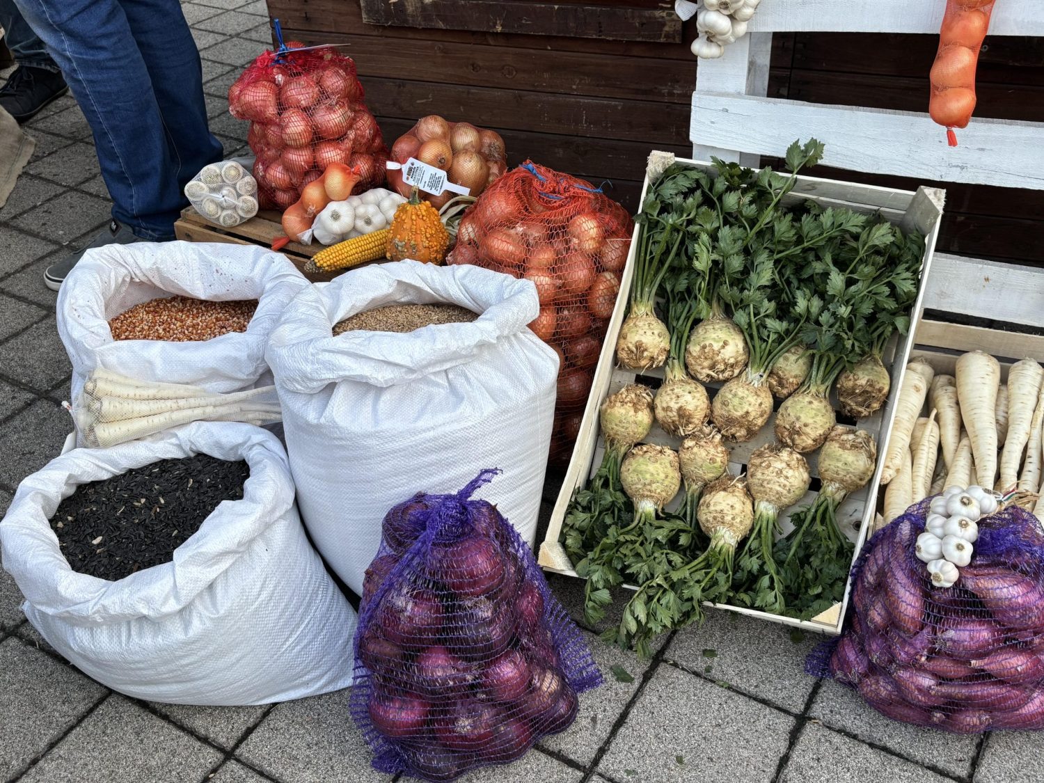 Vass Gábor, a Csanád és Térsége Gazdakör elnöke a makói földeken megtermelt zöldségek és egyéb helyi különlegességek gazdag kínálatát sorakoztatta fel a bódéban. A vöröshagyma mellett petrezselyem, fokhagyma, mák, cirok és méz is helyet kapott a pultokon.