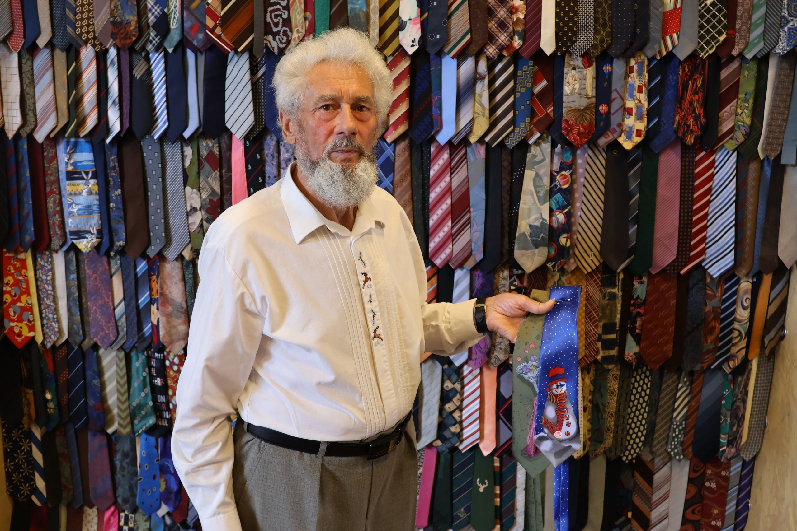 A művelődési házban állították ki a gyűjteményének jelentős részét, pontosan 365 darab nyakkendőt. A nyugdíjas hivatásos vadásztól megtudtuk: otthonában még van 70 darab másik, de azok nem fértek fel arra a speciális tartóra, melyet ő tervezett és a szintén földeáki Mészáros Tibor bútorasztalos készített el a számára. János bácsi megmutatta az egyik kedvencét, egy karácsonyi nyakkendőt, melynek különlegessége az, hogy zenél is.