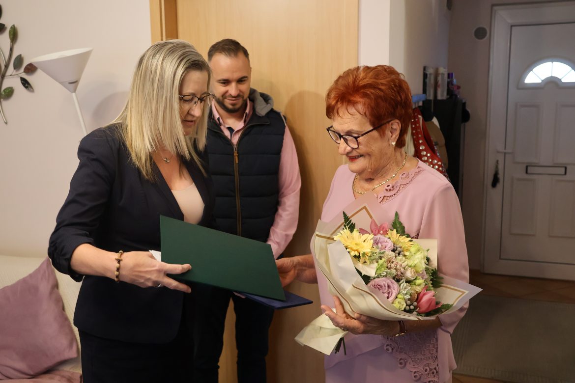 A családján kívül Farkas Éva Erzsébet polgármester és Tóth Ferenc önkormányzati képviselő is felköszöntötte Ica nénit. Fotó: Kormos Tamás