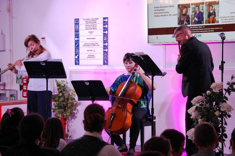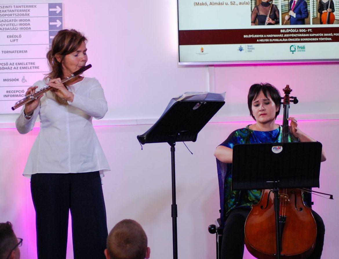 Október 1-én, szerdán 17 órakor különleges helyszínen, a Makói Általános Iskola és Alapfokú Művészeti Iskola remek akusztikájú aulájában gyönyörű hangverseny várta a közönséget. A Zene Világnapja alkalmából Kaczander Orsolya fuvolaművész, Karasszon Eszter csellóművész és Szilágyi Szabolcs fuvolaművész, a Concerto Budapest kamaraművészei léptek színpadra.