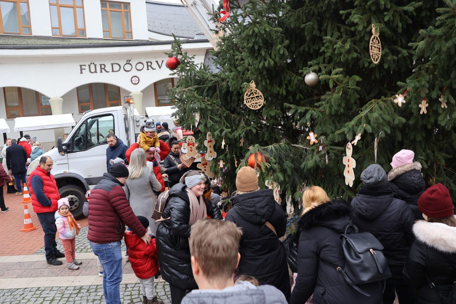 A Hagymatikum Gyógyfürdő előtt már teljes pompájában áll a város fenyőfája. Érdemes arra sétálni és megcsodálni, valamint az alsóbb ágakon megkeresni az aprócska mézeskalácsot mintázó figurákat. Ugyanis a hátoldalukon található egy-egy kedves kis karácsonyi idézet az óvodásoktól.