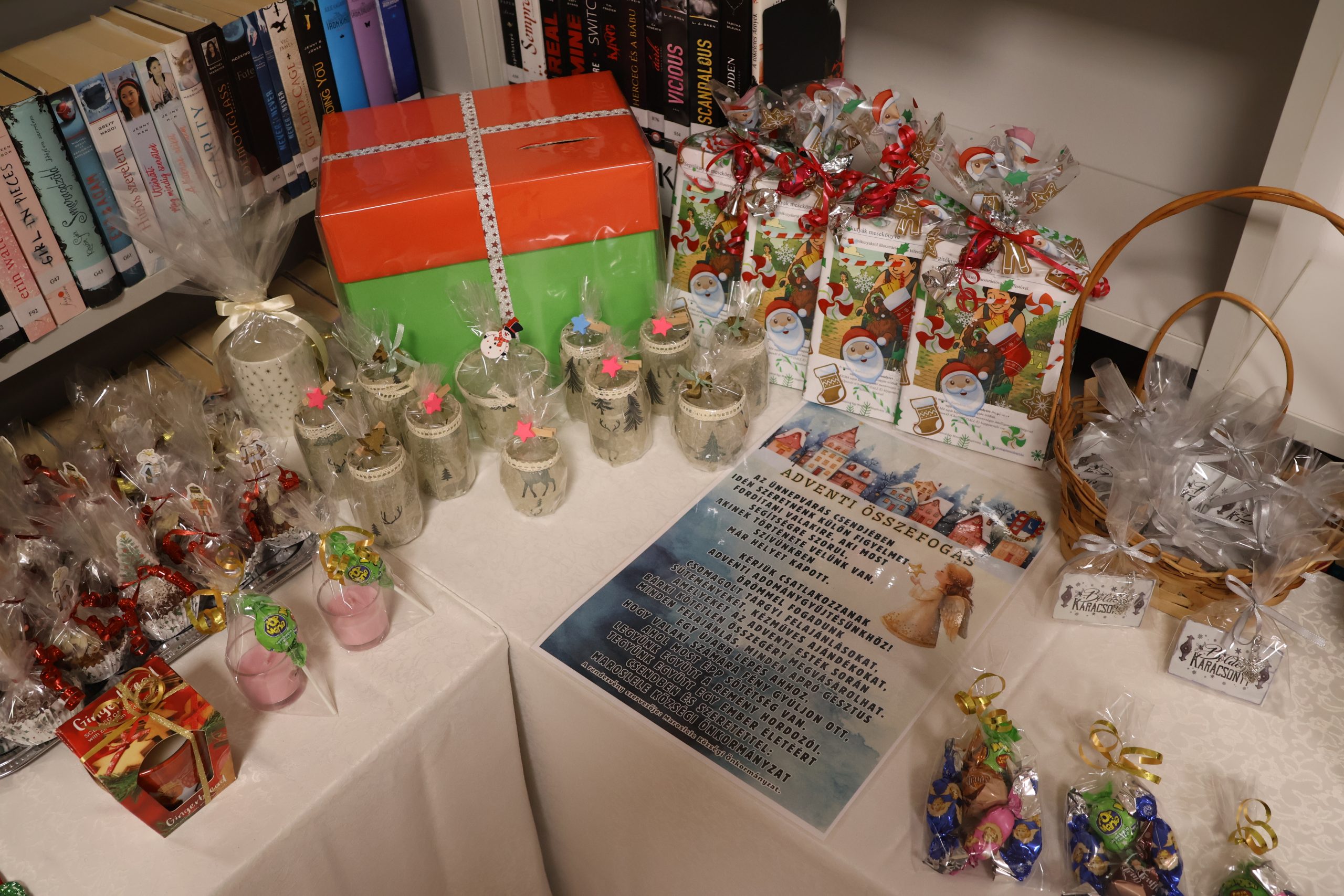 A leleiek korábban jótékonysági sütivásárt már tartottak annak érdekében, hogy segítő kezet nyújthassanak valakinek. Az idén azonban kibővítették a kínálatot, vagyis maguk által készített ajándékokat, kis karácsonyi csomagokat, édességet, szóval nagyon sok mindent hoznak be folyamatosan a könyvtárba, hogy oda tegyék az asztalkára. Így a vásárlók mindig újabb és újabb dolgokat vehetnek, így gyarapítva az adománygyűjtő doboz tartalmát.