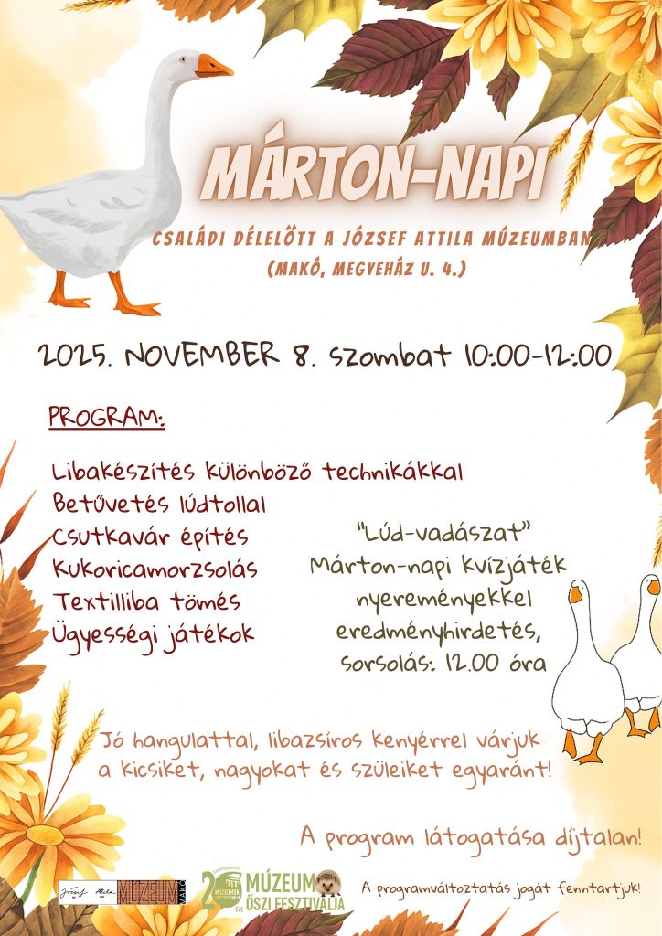 A József Attila Városi Múzeum idén is különleges családi programmal készül Márton-nap alkalmából. A november 8-án, szombaton 10 és 12 óra között megrendezett eseményen a kicsik és nagyok egyaránt átélhetik az őszi néphagyományok hangulatát.