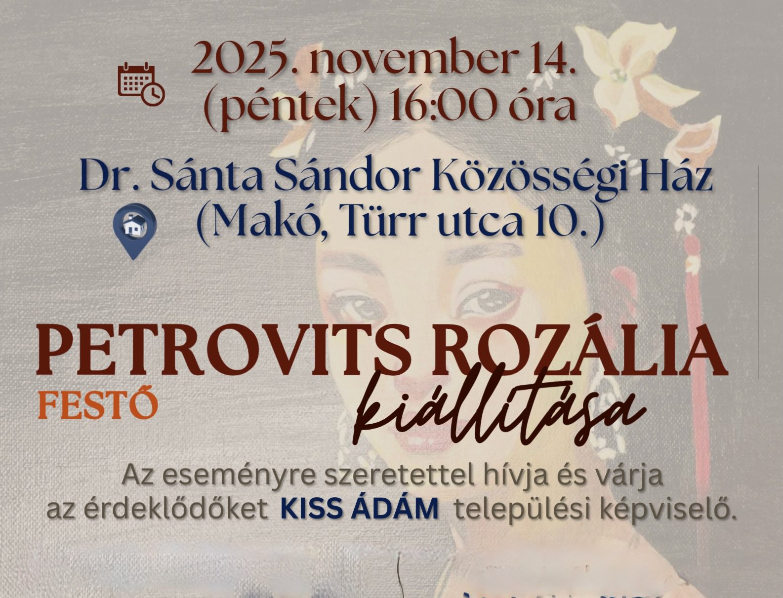 A megnyitón a Makói Ifjúsági Roma Folklór Együttes működik közre. A megnyitóra mindenkit szeretettel vár Kiss Ádám települési képviselő. Petrovits Rozália tárlata november 27-ig tekinthető meg.
