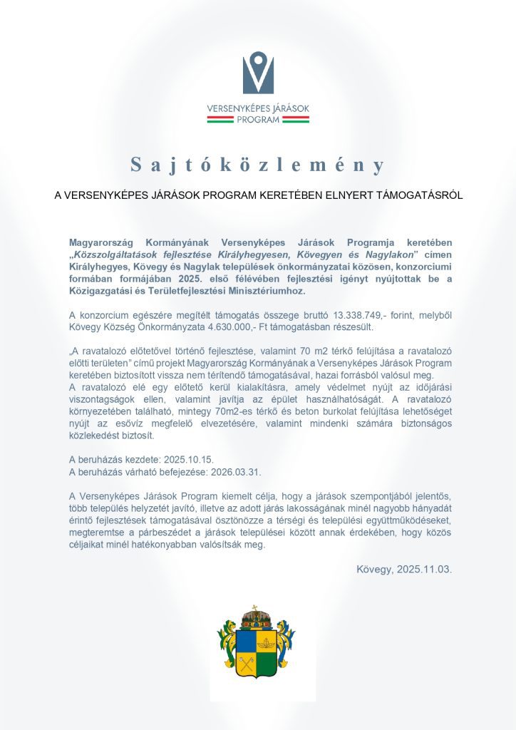 Mint már korábban beszámoltunk róla, a Versenyképes Járások Program keretében, a „Közszolgáltatások fejlesztése Királyhegyesen, Kövegyen és Nagylakon” elnevezésű projektre a három említett Csongrád-Csanád vármegyei település önkormányzatai közösen, konzorciumi formában nyújtották be fejlesztési igényüket. Ez egy nyertes pályázat lett, amiből mindhárom község profitál. A konzorcium egészének megítélt támogatás összege bruttó 13.338.749 forint.