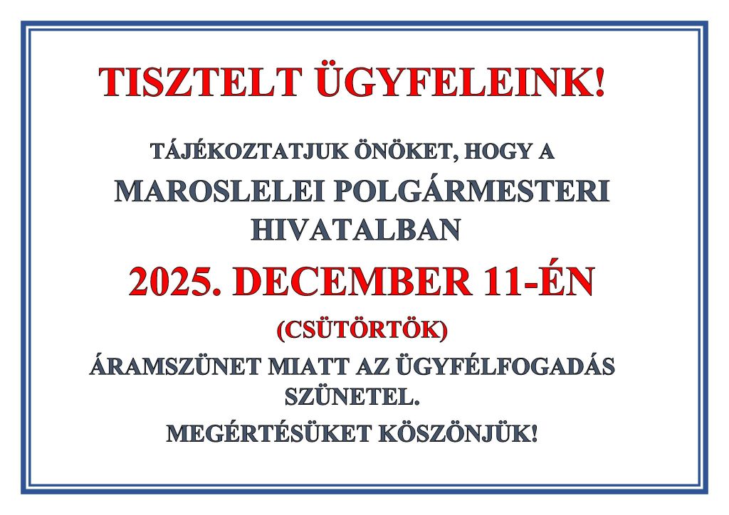 A hirdetmény szerint áramszünet miatt lesz zárva a hivatal. Mindenkitől megértést kérnek – írják a maroslelei önkormányzat közösségi oldalán.