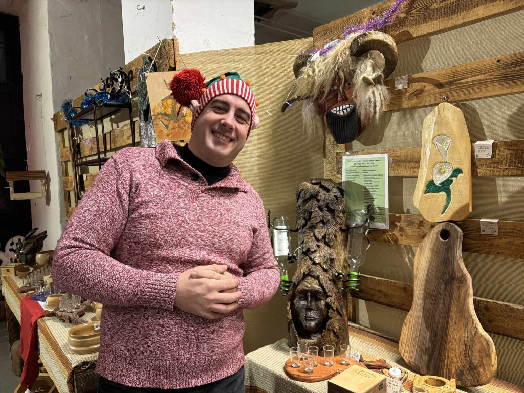 A vásár egyik árusa, Bede Danijel fafaragó, aki egész évben a Famíves Manufaktúra és Bemutatóteremben dolgozik, az advent idején pedig különösen nagy hangsúlyt fektet a karácsonyi dekorációkra. Elmondta: hóembereket, fenyőfákat, világítós fadíszeket, valamint használati és ajándéktárgyakat is kínál, többek között fatálak, pálinkakínálók, vágódeszkák és különféle egyedi faragott tárgyak közül választhatnak az érdeklődők. Hangsúlyozta: minden darab kézzel készült, nincs két teljesen egyforma termék, ezért sokan személyes, különleges ajándékként választják ezeket.