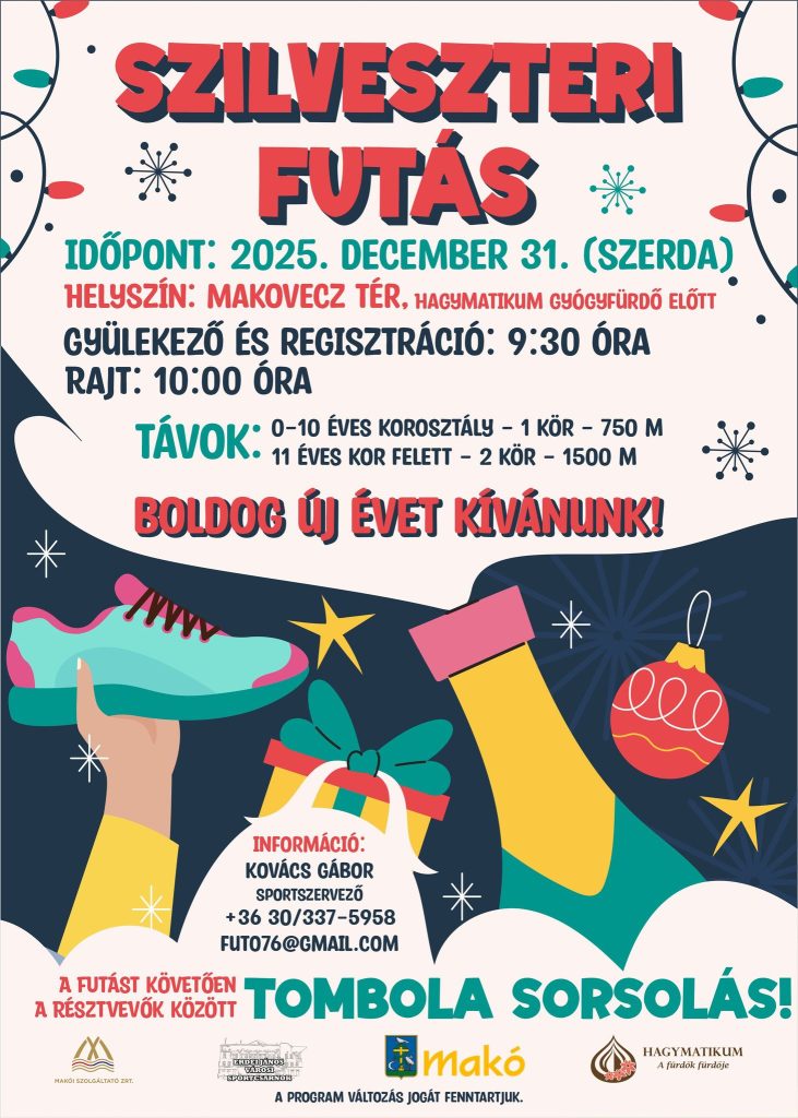 Az év utolsó, elmaradhatatlan sporteseménye a szilveszteri futás Makón, így természetesen idén is megszervezik. A hagyományokhoz híven ezúttal is a Hagymatikum előtt lesz a gyülekező. Regisztráció reggel 9:30-tól, a rajthoz állás pedig 10:00-kor lesz.