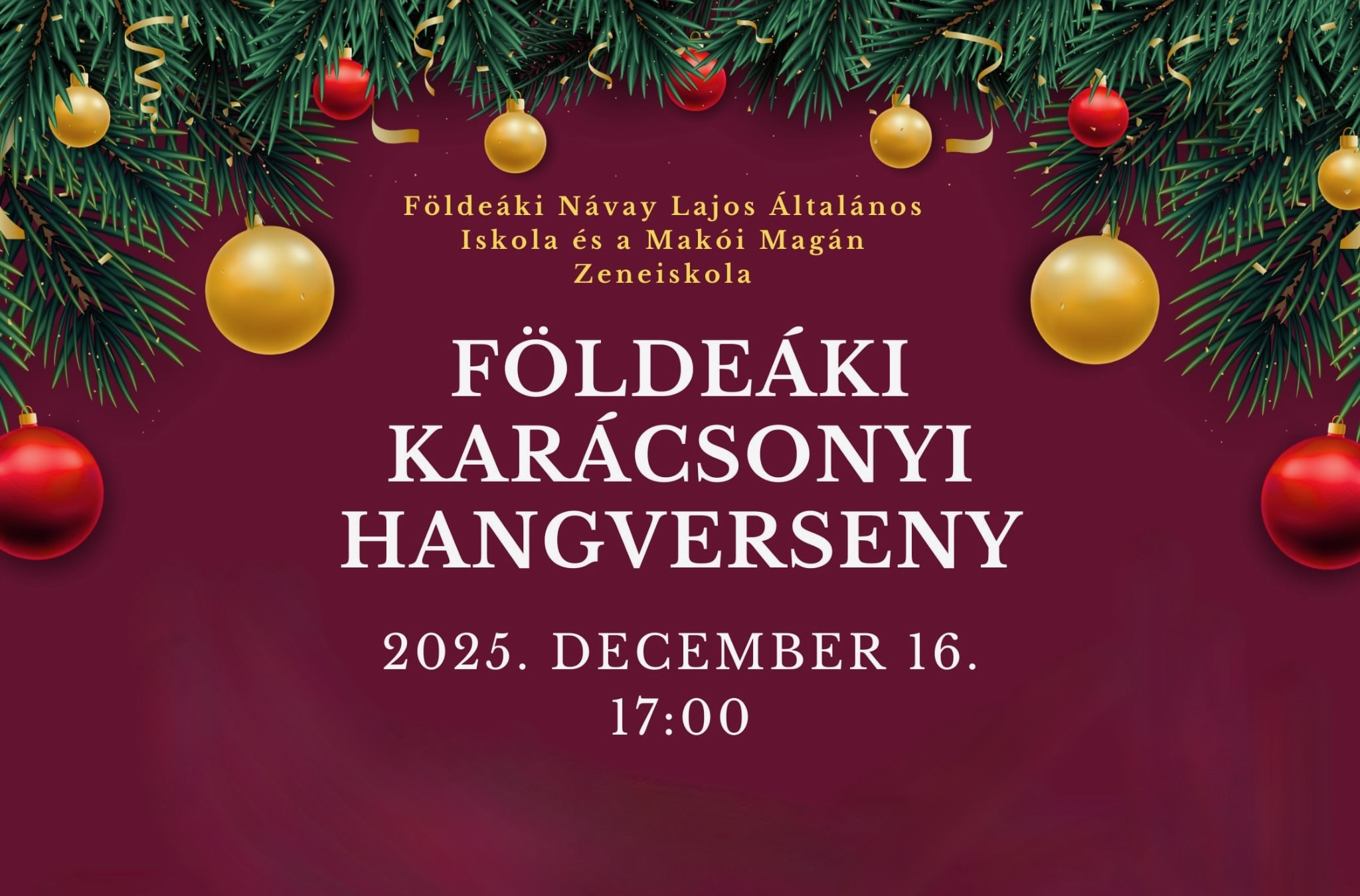December 16-án, kedden a Földeáki Návay Lajos Általános Iskola tornacsarnoka ad otthont a karácsonyi hangversenynek.