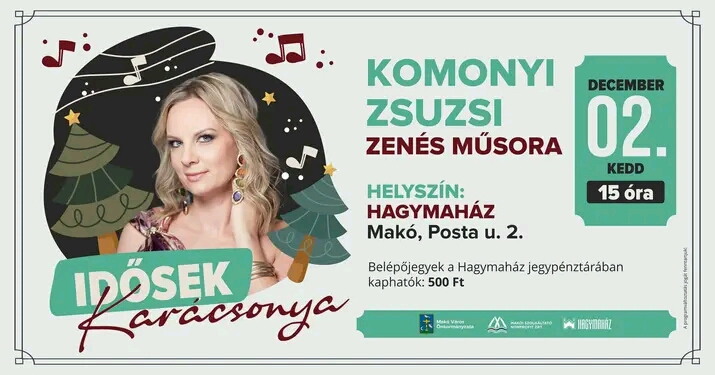 A kecskeméti énekesnő, Komonyi Zsuzsi lép fel december2-án, kedden a Hagymaházban az Idősek karácsonyán. A népszerű művész legszebb slágereit hozza el Makóra.