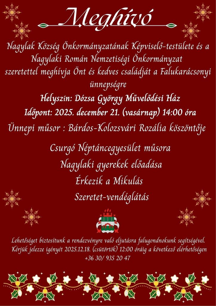 A település önkormányzata, illetve a Nagylaki Román Nemzetiségi Önkormányzat december 21-én 14 órától a művelődési házban rendezi meg a falukarácsonyt, amelyre minden érdeklődőt szeretettel várnak.