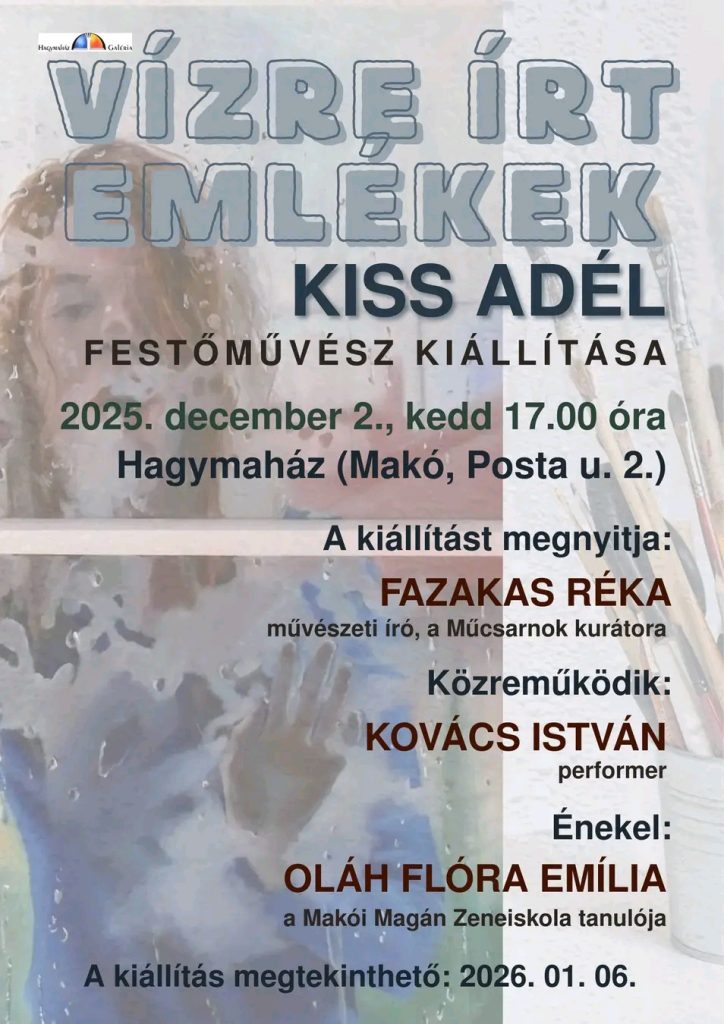A festőművész tárlata december 2-án, kedden, 17:00 órakor nyílik. A rendezvényen Fazakas Réka művészeti író, a Műcsarnok kurátora mond beszédet, közreműködik Kovács István performer, énekel Oláh Flóra Emília, a Makói Magán Zeneiskola tanulója.