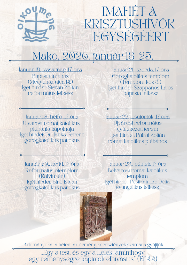 Vasárnaptól egy héten át közös imádságra és istentiszteletekre várják a híveket Makón. Célja, hogy a különböző keresztény felekezetek együtt imádkozzanak és erősítsék az egységet. A programsorozatnak évtizedes hagyománya van már a városban.
