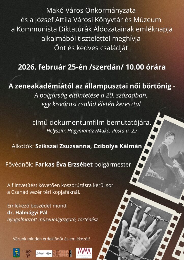 Megemlékezésre invitálja Makó város a lakosait 2026. február 25-én szerdán. Először egy dokumentumfilmet tekinthetnek meg az összegyűltek, majd koszorúzásra kerül sor. A kommunista diktatúrák áldozatairól emlékeznek meg.