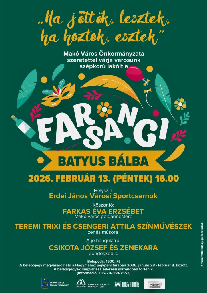 Már most beírhatja a naptárába! Február 13-án, pénteken Farsangi batyus bál lesz Makón, a városi sportcsarnokban az önkormányzat szervezésében. A közönséget Teremi Trixi és Csengeri Attila színművészek zenés műsora szórakoztatja majd, a jó hangulatról Csikota József és zenekara gondoskodik. Köszöntőt mond Farkas Éva Erzsébet polgármester.