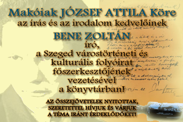 Beszélgetésre, gondolatcserére, a versek és a prózák világának közös felfedezésére hívja a Makóiak József Attila Köre az irodalombarátokat. A rendezvény házigazdája és moderátora Bene Zoltán író, a Szeged című várostörténeti és kulturális folyóirat főszerkesztője.