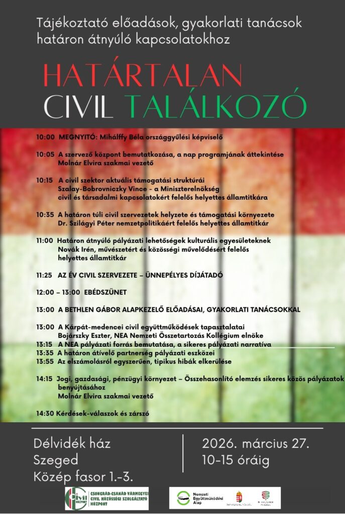 A Csongrád-Csanád Vármegyei Civil Közösségi Szolgáltató Központ az utóbbi három évben sokat tett azért, hogy az országhatáron átnyúlóan segítse, támogassa a civil partnerséget. Legközelebbi erre irányuló rendezvényük, a Határtalan Civil Találkozó is erről szól. A célja az, hogy az együttműködésre nyitott civil szervezetek képviselőinek egy szakmai program keretében szakpolitikusok és a támogatáskezelő bevonásával naprakész információkat nyújtson azokról a hazai pályázati lehetőségekről, amelyekre a határon túli szervezetek is pályázhatnak – önállóan vagy közös projektek megvalósítására. A március 27-i találkozóra a Délvidékről, a temesi Bánságból és Csongrád-Csanád vármegyéből várnak civil szervezeteket a Délvidék házba.